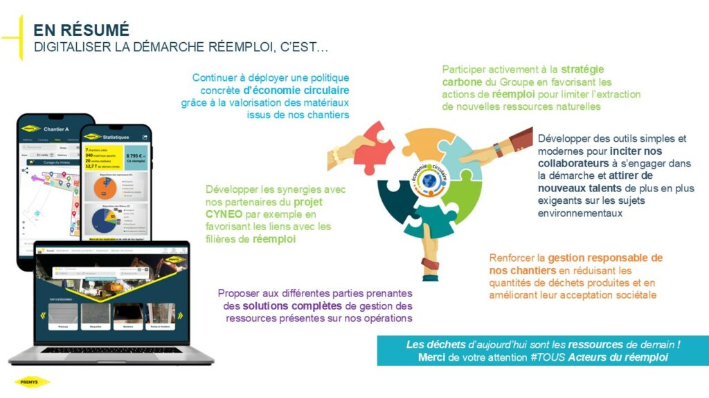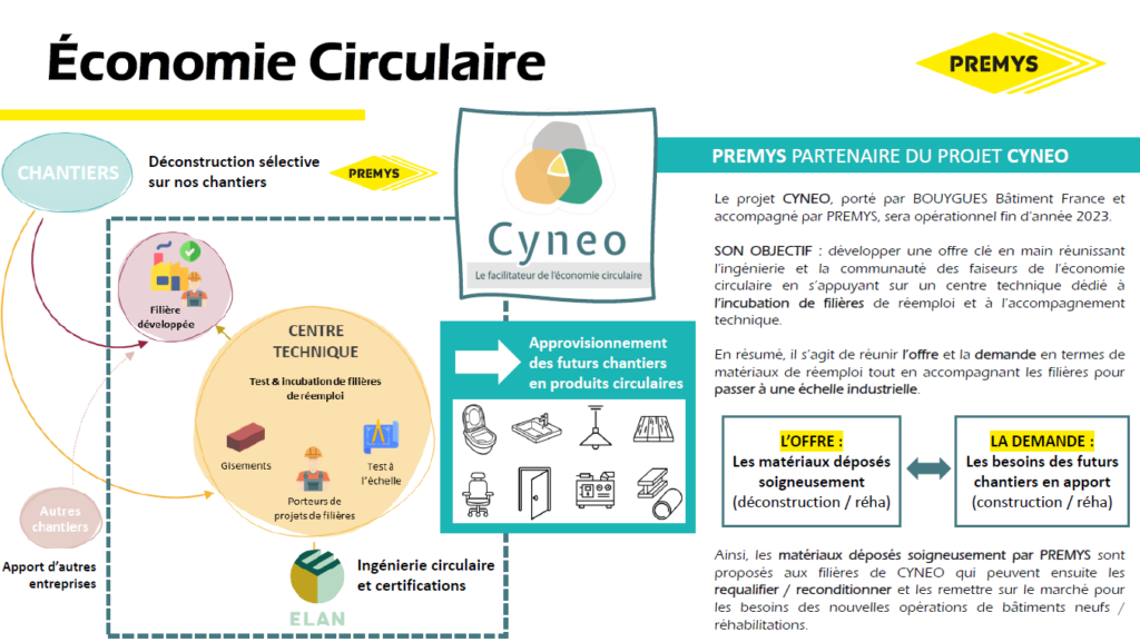 Premys, acteur majeur de la prévention, du tri sur chantier et du recyclage depuis plusieurs années, s’engage à proposer des solutions pour réduire l’empreinte carbone de ses projets. Nous privilégions le développement de l’économie circulaire en maximisant l’utilisation des ressources, notamment par le réemploi et la réutilisation.
